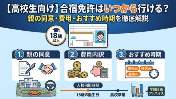 「高校生でも合宿免許に行けるの?」「いつから申し込めるんだろう?」と気になっていませんか? この記事では、高校生が合宿免許で免許を取得する際の入校可能時期について、保護者の同意書・必要書類、高校への届出、費用負担の方法、おすすめの時期まで網羅的に解説します。 この記事を読めば、高校生が合宿免許に行くための全体像が理解でき、計画的に準備できます。(複雑な手続きも一度にわかります!) この記事でわかる… -