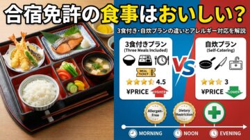 合宿免許の食事はおいしい?3食付き・自炊プランの違いとアレルギー対応を解説 「合宿免許って2週間も泊まるけど、食事は大丈夫なの?」と不安に感じていませんか? 「ご飯がまずかったらどうしよう」「アレルギーがあるけど対応してくれるかな」「自炊プランの方が節約できる?」など、食事に関する疑問は合宿免許を検討する上で大きな悩みの一つですよね。 この記事では、合宿免許の食事事情について、プランの種類や実際の… -