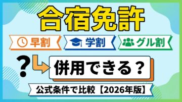 合宿免許の早割・学割・グル割は併用できる?公式・掲載条件で比較【2026年版】 合宿免許の料金を見比べていると、早割・学割・グル割が並んでいて「結局どれをどう組めば安いの?」と迷いやすいですよね。実は、同じ5,000円引きでも、併用できるかどうか、申込時に安くなるのか卒業時に戻るのか、対象外プランがあるのかで実質のお得度はかなり変わります。 早割・学割・グル割の違いと、併用できる学校・できない学校…