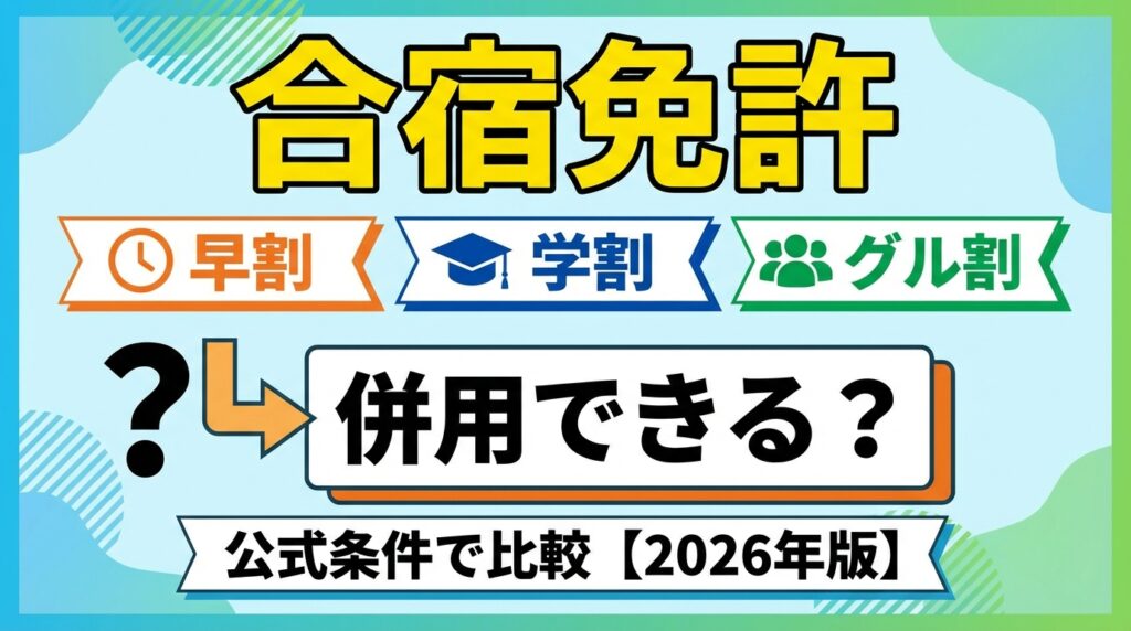 本記事では、合宿免許の早割・学割・グル割の併用可否と学校ごとの違いを、2026年時点で確認できた学校公式ページまたは掲載ページの条件をもとにわかりやすく解説します。(専門知識は不要です!)