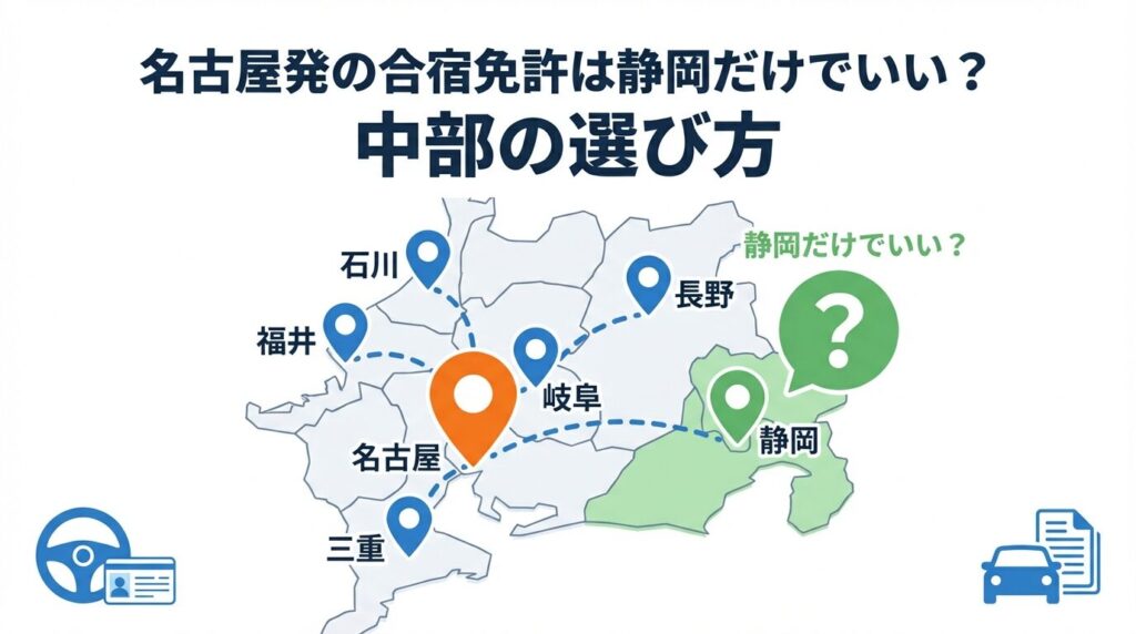 「静岡の学校」「長野の学校」と大きくまとめて見ると、判断が粗くなります。実際には、同じ県内でも交通費条件、集合時間、宿泊先、周辺環境がかなり違います。比較の軸を広げたい場合は、まず後悔しない自動車学校の選び方も合わせて確認し、そこから名古屋発向けに絞るのが効率的です。